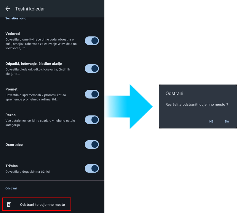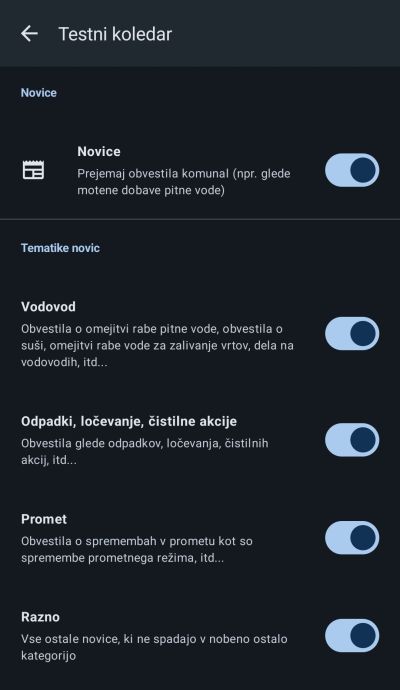 Če želite omogočiti ali onemogočiti obvestila komunal, kliknite na Novice, če pa želite omogočiti ali onemogočiti katero izmed tematike, pa to storite pod Tematike novic.