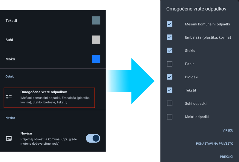 To storimo tako, da kliknemo na Omogočene vrste odpadkov, v novem pojavnem oknu pa odkljukamo vrste odpadkov, za katere ne želimo prejemati obvestil in jih ne želimo prikazati v samem koledarju. Izbiro potrdimo s klikom na gumb V redu.