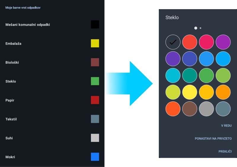 Pod moje barve vrst odpadkov kliknemo na želeno vrsto odpadkov. V pojavnem oknu pa izberemo želeno barvo. Izbiro potrdimo s klikom na gumb V redu.