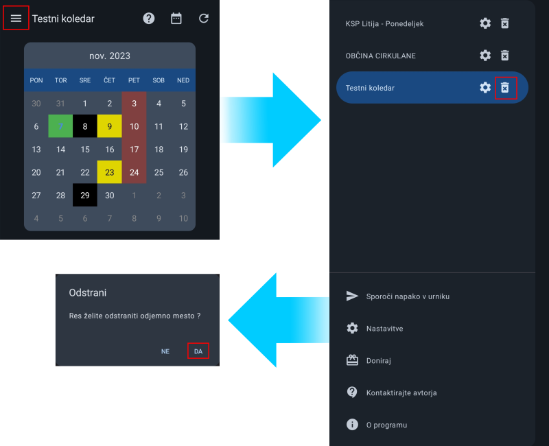 2. Drugi način pa je iz začetnega zaslona v Smetarju. V levem kotu kliknemo na hamburger meni, poleg imena odjemnega mesta kliknemo na ikono koša za smeti, nato pa v zadnjem koraku na vprašanje Res želite odstraniti odjemno mesto? odgovorimo z DA.