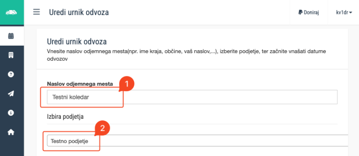 4. Če želite spremeniti naslov odjemnega mesta, lahko to storite v polju Naslov odjemnega mesta (1), če želite spremeniti podjetje, ki odvaža odpadke, pa to spremenite pod Izbira podjetja (2).