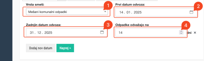 7. Pojavila se bodo 4 nova polja. V polju Vrsta smeti (1) izberite želeno vrsto smeti. V polju Prvi datum odvoza (2) izberite prvi datum odvoza, v polju Zadnji datum odvoza (3) pa zadnji datum. V polju Odpadke odvažajo na (4) vnesite interval (na koliko dni odvažajo smeti. Spletna stran bo zgenerirala datume odvozov od prvega pa do zadnjega vnesenega datuma, med vsakim datumom odvoza pa bo toliko dni, kot ste jih vnesli pod Odpadke odvažajo na (4). Npr. če je prvi datum odvoza 14.1.2025, interval pa 14 dni, potem bo prvi datum odvoza 14.1.2025, naslednji 28.1.2025, potem 11.2.2025 in tako dalje. Pomnite, da če že imate datume za določeno vrsto odpadkov, bodo novi datumi dodani starim datumom dovozov. Če tega ne želite, najprej odstranite vse datume za določeno vrsto odpadkov, šele nato dodajte nove. Glej korak 5 za več informacij.