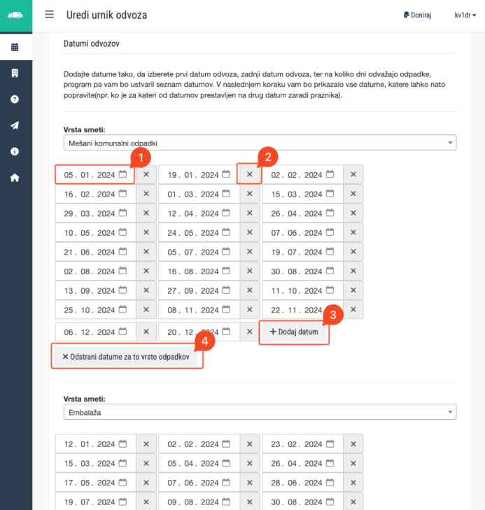 5. Pod naslovom Datumi odvozov so izpisani datumi odvozov v trenutnem koledarju. Če želite spremeniti datum odvoza, kliknite na želeni datum odvoza (1). Če želite odstraniti datum odvoza, kliknite na x poleg želenega datuma odvoza (2). Če želite dodati novi datum odvoza, kliknite na Dodaj datum (3). Če pa želite odstraniti vse datume za določeno vrsto odpadkov, pa kliknite Odstrani datume za to vrsto odpadkov (4).