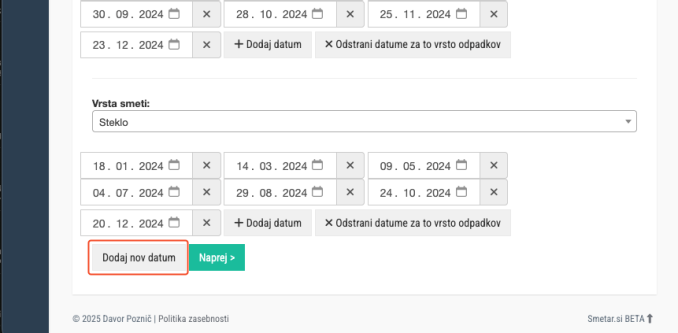 6. Če želite dodati več datumov odvozov na enkrat kliknite na Dodaj nov datum na dnu strani.